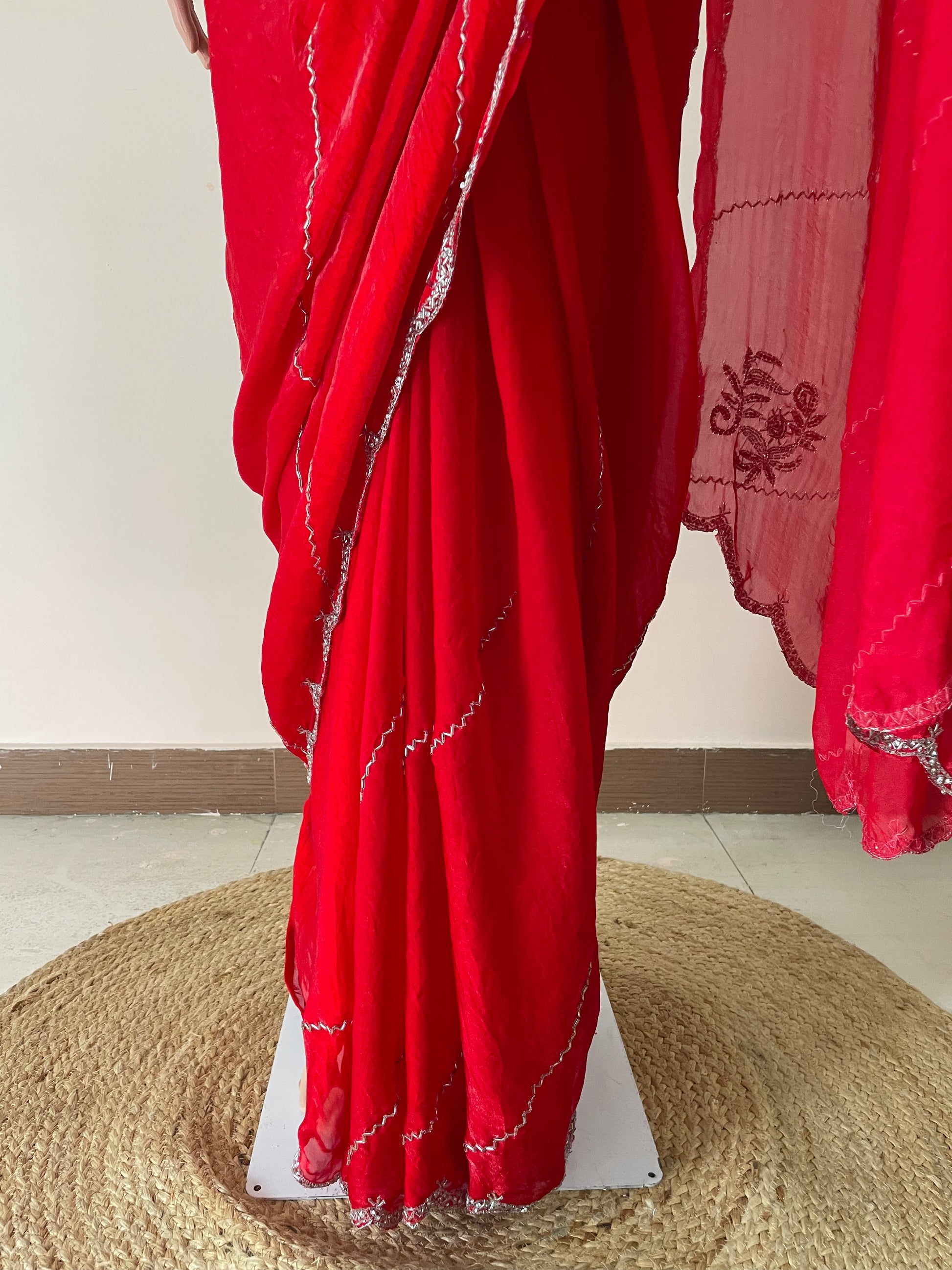 Elevate your festive look with this stunning Party Wear Tissue Silk Saree adorned with intricate Swarovski work. Crafted from luxurious tissue silk fabric, the saree boasts a delicate sheen that catches the light beautifully, offering an ethereal and graceful appeal. The sophisticated Swarovski embellishments add a touch of opulence, with carefully placed crystals shimmering along the border, pallu, and selected areas of the saree, enhancing its grandeur.