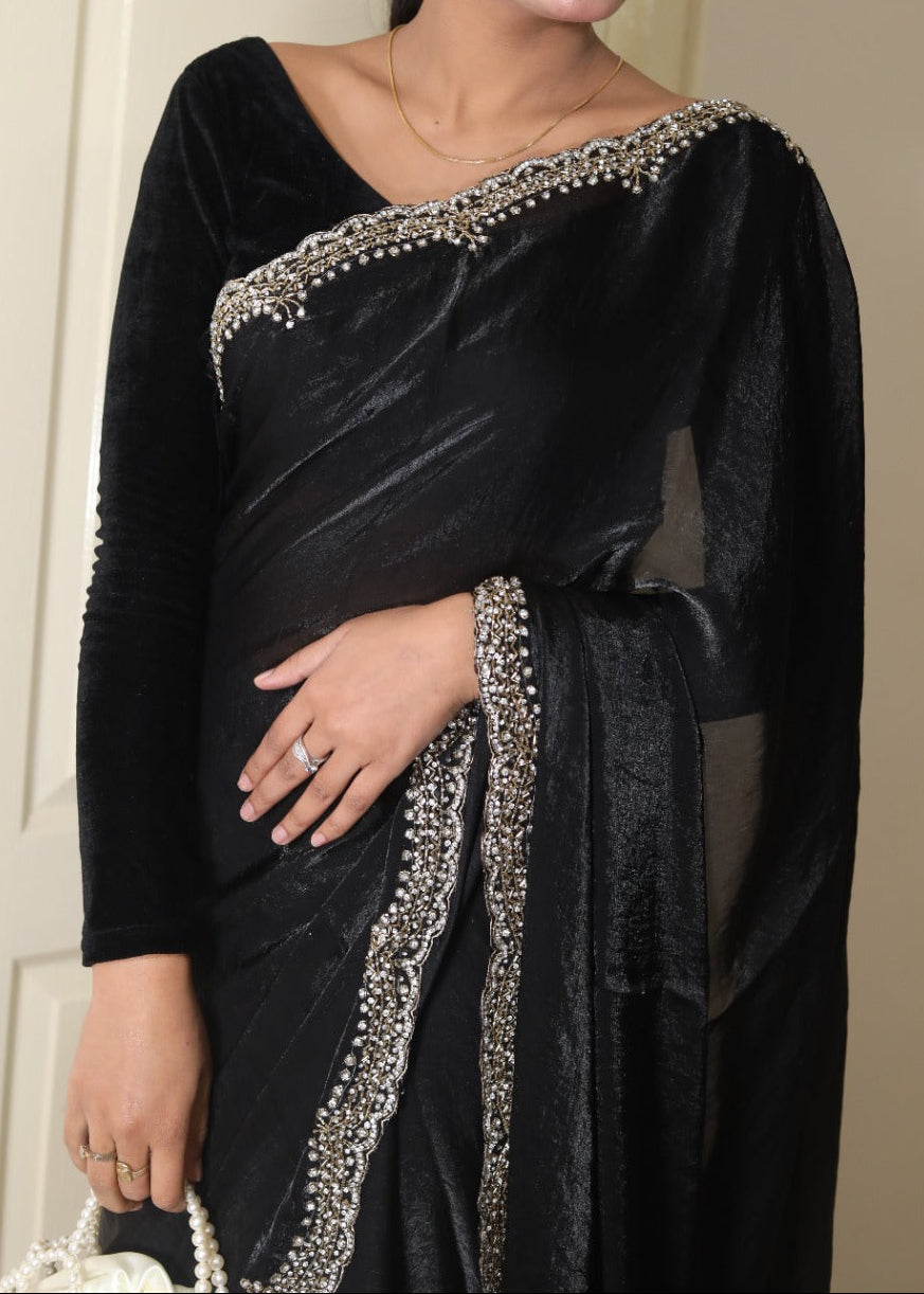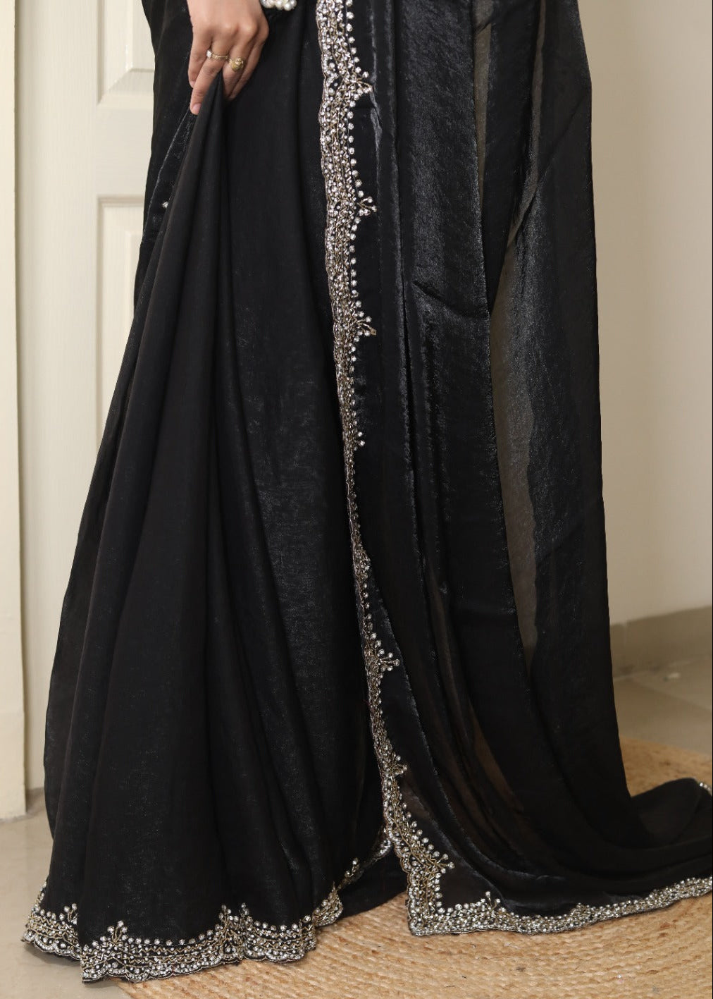 This party wear tissue saree is beautifully enhanced with intricate cut dana handwork, offering a stunning combination of shine and elegance. The sheer tissue fabric drapes gracefully, while the delicate bead and pearl embellishments create a luxurious, velvety shimmer. Perfect for festive occasions, this saree exudes timeless glamour and sophistication, making you the center of attention at any celebration.