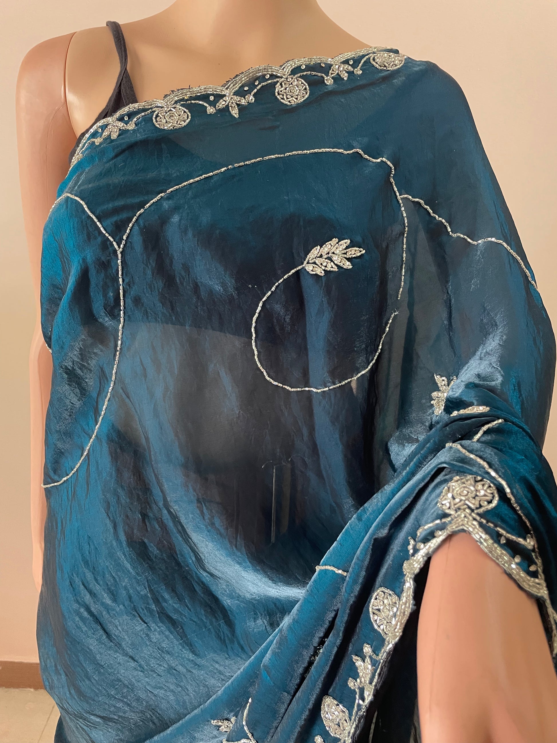 A heavy embroidered Tissue Silk saree is a luxurious and opulent piece of traditional Indian attire, designed to make a bold statement. The fabric itself, satin silk, is smooth, glossy, and lustrous, giving the saree a rich and elegant finish. The satin weave enhances the fabric's shine, making it perfect for special occasions like weddings, festivals, and evening events.